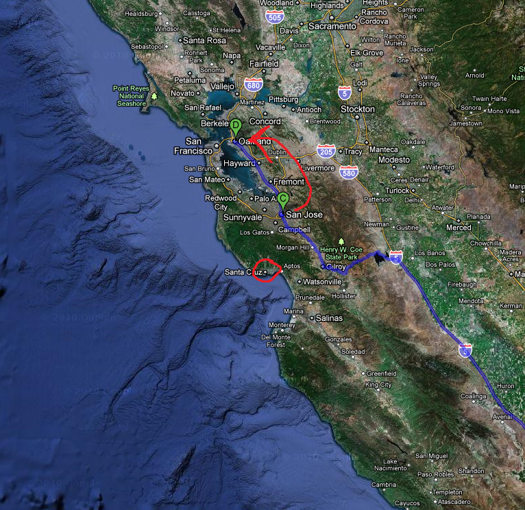 well this sucks. My package went from Oklahoma city to Dallas Texas, Then from Dallas it went straight to San Jose which is pretty much just barely north of me. I got all excited when I saw it arrived in San Jose about 4 hours ago since that would mean I'd get my package tomorrow or the day after. BUT THEN, it went from San Jose, to OAKLAND. Oakland is AWAY from me. Fuck you UPS.